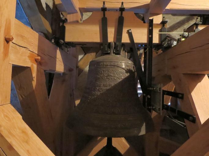 Keywords: Schönheide im Erzgebirge Martin-Luther-Kirche Glocke von 1774.jpg Schönheide im Erzgebirge Nach der Feststellung irreparabler Schäden an den drei Glocken von 1922 und leichter Reparaturbedürftigkeit der Glocke von 1774 Meisterglocke ließ die Martin-Luther-Kirchgemeinde in Karlsruhe bei der Glockengießerei Bachert zwei neue Glocken gießen und die Glocke von 1774 in der Spezialwerkstatt Glockenschweißerei Lachenmeyer in Nördlingen reparieren Die Weihe der beiden neuen Glocken und der reparierten alten Glocke fand am 27 Januar 2013 auf dem Platz vor der Kirche statt Das Mitglied des Kirchenvorstands Tischlermeister Markus Trommer sprach bei der Glockenweihe bevor er die Glocke von 1774 anschlug Er sagte <<Diese Meisterglocke ist die älteste unserer Glocken eine historische Glocke und ich möchte erst einmal aus der Schönheider Chronik von Ernst Flath etwas zur Geschichte vorlesen žDie sogenannte Meisterglocke die schönste laut Inschrift von J C Sieber in Leipzig 1774 zum dritten Male umgegossen zeigt das kursächsische Wappen und elf Rundreliefs mit Zunftzeichen; sie ist mit der Umschrift versehen šGott erhör Gebet hienieden und gib uns Heil und edlen Frieden ˜ Auf der dem Wappen entgegengesetzten Seite steht šGott allein die Ehre Im Jahre 1774 da Her sic D Straus Superint endent in Plauen Herr Magister Christian Friedrich Vogel Pastor in Schönheyde war haben die löblichen Handwerker nach überstandener schwerer Hunger- und Sterbe-Noth diese Glocke zum drittenmahl giesen sic laßen sic ˜ Geweiht wird die Glocke heute zum vierten Mal Und dann hing sie bis 1917 als mittlere Glocke im Turm Die größere und die kleine Glocke wurden 1917 abgenommen und eingeschmolzen 1922 wurde auch die Meisterglocke abgenommen da drei neue Stahlglocken angeschafft wurden Ab da stand sie im Eingangsbereich unserer Kirche 1935 wurde sie auf Drängen der örtlichen Handwerksmeister zum zweiten Mal geweiht und wieder als vierte Glocke in den Turm gebracht jedoch im Zweiten Weltkrieg wieder abgebaut und zum Glockenfriedhof nach Hamburg geschafft glücklicherweise aber nicht eingeschmolzen Nach Kriegsende kam sie von Hamburg zurück und wurde am 13 September 1948 zum dritten Mal geweiht und wieder in den Turm gehängt Es ist für mich als Schönheider Handwerksmeister eine große Ehre heute den Segensspruch für diese Glocke zu sprechen Ich habe dazu einen Bibelvers aus Römer 12 Vers 12 ausgesucht žSeid fröhlich in Hoffnung geduldig in Trübsal beharrlich im Gebet >> Die Meisterglocke von 1774 hat einen Durchmesser vom 800 Milimetern ein Gewicht von 270 Kilogramm und ist auf den Ton c gestimmt Die Umschrift auf der Glocke lautet - anders als von Ernst Flath auf Seite 101 angegeben - Gott erhör Gebet hienieden und gieb uns Glück und edlen Frieden Das Foto zeigt die Glocke im Kirchturm im neuen Glockenstuhl aus Eiche hängend gefertigt vom Schönheider Zimmermeister Mike Höpke own Klaaschwotzer 2013-12-01 Martin Luther Church in Schönheide Bells of Martin Luther Church Schönheide Cc-zero |