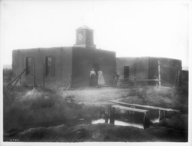 | Keywords: School house at the pueblo of San Rafael, New Mexico, ca.1900 (CHS-4751).jpg en <br> School house at the pueblo of San Rafael New Mexico ca 1900 Photograph of the school house at the pueblo of San Rafael New Mexico ca 1900 Two women and a man stand in front of the small block-shaped adobe building A square wooden bell tower sits on the roof Another small adobe building is adjacent right A small creek is crossed by a crude wooden bridge in the foreground Call number CHS-4751 Photographer James George Wharton Filename CHS-4751 Coverage date circa 1900 Part of collection California Historical Society Collection 1860-1960 Type images Geographic subject city or populated place San Rafael Repository name USC Libraries Special Collections Accession number 4751 Microfiche number 1-179- Archival file chs_Volume98/CHS-4751 tiff Part of subcollection Title Insurance and Trust and C C Pierce Photography Collection 1860-1960 Repository address Doheny Memorial Library Los Angeles CA 90089-0189 Geographic subject country USA Format aacr2 3 photographs photonegative photoprints b w ; 21 x 26 cm 17 x 22 cm Rights Digitally reproduced by the USC Digital Library; From the California Historical Society Collection at the University of Southern California Subject adlf religious facilities Project USC Repository email specol usc edu Identifying number unidentified no James-1458 Contributing entity California Historical Society Date created circa 1900 Publisher of the digital version University of Southern California Libraries Format aat negatives photographic ; photographic prints; photographs Geographic subject state New Mexico Legacy record ID chs-m17137; USC-1-1-1-13971 Access conditions Send requests to address or e-mail given Phone 213 821-2366; fax 213 740-2343 Subject file heading Indians -- Pueblo -- Pueblo villages New Mexico; Indians -- Pueblo villages New Mexico Subject lcsh Indians of North America Subject Pueblo Indians; Pueblos of New Mexico circa 1900 date created George Wharton James 1858 1923 http //digitallibrary usc edu/cdm/ref/collection/p15799coll65/id/17149 PD-old-70-1923 Images from USC Digital Library uploaded by Fæ Photographs by George Wharton James California Historical Society Collection 1860-1960 San Rafael |