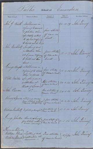| Keywords: archives state records nsw staterecordsnsw newsouthwales blackandwhite schools eurunderee mudgee orana text document writing texture outdoor photo border black and white This archive is part of our new gallery celebrating the 50th Anniversary of State Records Although punishments at school have changed and corporal punishment is no longer allowed, we can see from the offences that children have not changed. This Punishment Book, from the school attended by Henry Lawson, is one of the earliest surviving examples of this type of record. It should be noted that there are no entries for Henry Lawson in this record. NRS 3931 Punishment Book Eurunderee, [4/7548] View on the Gallery » Rights: www.records.nsw.gov.au/about-us/rights-and-permissions We'd love to hear from you if you use our photos/documents. This archive is part of our new gallery celebrating the 50th Anniversary of State Records Although punishments at school have changed and corporal punishment is no longer allowed, we can see from the offences that children have not changed. This Punishment Book, from the school attended by Henry Lawson, is one of the earliest surviving examples of this type of record. It should be noted that there are no entries for Henry Lawson in this record. NRS 3931 Punishment Book Eurunderee, [4/7548] View on the Gallery ยป Rights: www.records.nsw.gov.au/about-us/rights-and-permissions We'd love to hear from you if you use our photos/documents. |