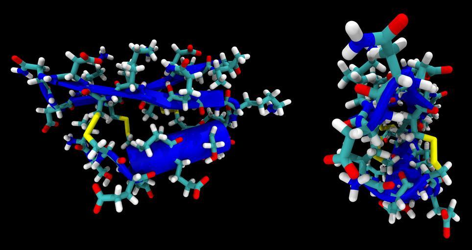 | Keywords: Scorpio-toxin-p01 1ACW.png  en cartoon/stick model of neurotoxin P01 from Androctonus mauretanicus mauretanicus Scorpion after PDB 1ACW Ref cite journal Blanc E Fremont V Sizun P et al Solution structure of P01 a natural scorpion peptide structurally analogous to scorpion toxins specific for apamin-sensitive potassium channel Proteins 24 3 359 “69 1996 March 8778783 10 1002/ SICI 1097-0134 199603 24 3<359 AID-PROT9>3 0 CO;2-B Created with VMD own Ayacop<br/>Please https //flattr com/thing/49307/Scorpio-toxin-3D-model flattr this 2010-06-18 Toxins Peptides |