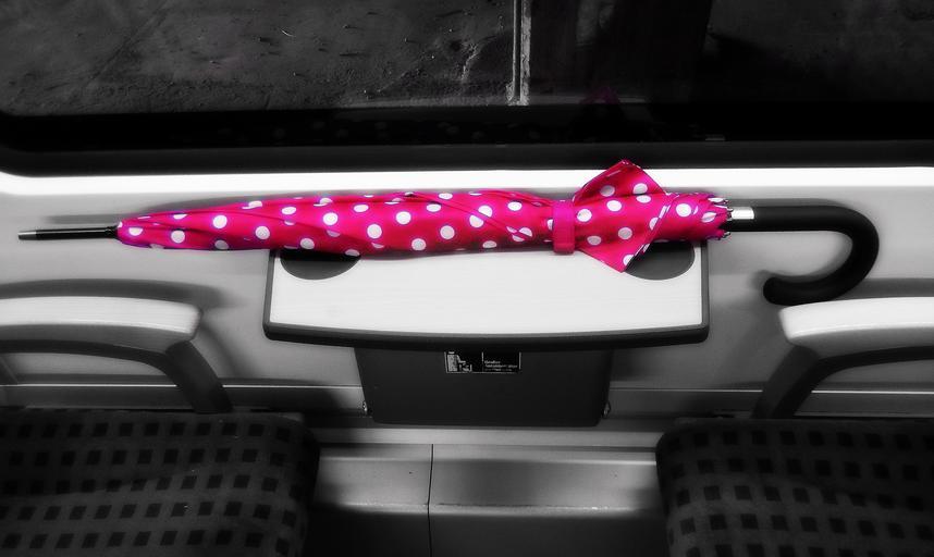 Keywords: screen zugfahrt train compartment travel umbrella rain emotion alone polka dots loss lost