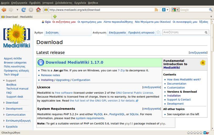 | Keywords: Screenshot-Download - MediaWiki - Mozilla Firefox - Greek language.png el Screen-shot Î±Ï ÏŒ την σελίδα κατεβάσματος του MediaWiki στα Ελληνικά en Screen-shot of the page of download page of MediaWiki in Greek language 2011-10-24 own Ggia cc-zero Uploaded with UploadWizard Screenshots of installing MediaWiki 1 17 0 at sch gr | ||||