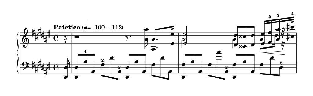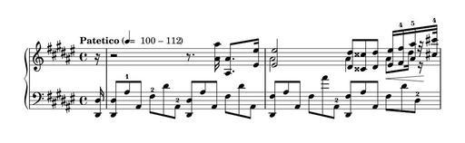 Keywords: Scriabin op.8 no.12.svg Étude in D-sharp minor Op 8 No 12 1894 2013-01-05 09 26 55 own Horndude77 cc-zero Lilypond source <code> \version 2 16 0 RH \relative c \tempo Patetico 4 100~112 \time 4/4 \partial 16 \key dis \minor r16 r2 r8 <ais ais'>16 <ais ais >8 <eis' eis >16 << <eis eis >2 \times 2/3 <dis dis >8 <cisis cisis > <dis dis > <eis eis >16 <fis fis >-4 <ais ais >-5 r32 <cis cis >-4 \\ ais 2 ais4 ais8 dis16 r >> LH \relative c \clef bass \key dis \minor <dis dis >16 \override Fingering 'staff-padding ' \times 2/3 <dis dis >8 ais'-1 ais \times 2/3 fis'-2 dis' ais -2 \times 2/3 <dis dis >8 ais' ais \times 2/3 fis' dis' ais \times 2/3 <fis' dis > ais ais \times 2/3 fis' ais' ais -2 \times 2/3 <fis' dis > ais ais \times 2/3 fis' dis' dis -2 Dyn s16 s1 s2 s8 \< s16\ \paper tagline f \score \new PianoStaff << \new Staff \RH \new Dynamics \Dyn \new Staff \LH >> \layout \context \Score extraNatural f \override TupletNumber 'stencil f </code> Uploaded with UploadWizard Compositions by Alexander Scriabin Sheet music examples Music in 1894 D-sharp minor |