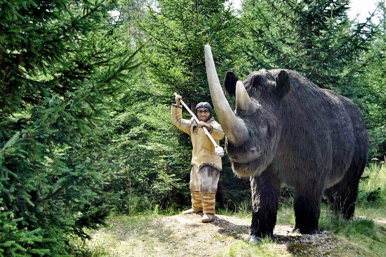 Keywords: sculpture animal sculpture woolly urzeittier landscape park firs trees primeval park theme park oranienburg hunting scene