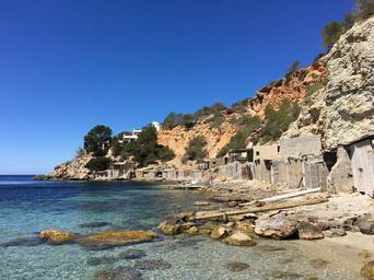 Keywords: sea cliff boat house ibiza coast beach blue sea island holiday ocean