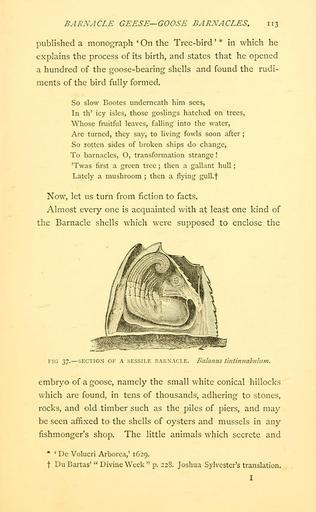 | Keywords: Sea fables explained (15400977429).jpg BARNACLE GEESE ”GOOSE BARNACLES <br> 113 <br> published a monograph ' On the Tree-bird ' in which he <br> explains the process of its birth and states that he opened <br> a hundred of the goose-bearing shells and found the rudi- <br> ments of the bird fully formed <br> So slow Bootes underneath him sees <br> In th' icy isles those goslings hatched on trees <br> Whose fruitful leaves falling into the water <br> Are turned they say to living fowls soon after ; <br> So rotten sides of broken ships do change <br> To barnacles O transformation strange <br> 'Twas first a green tree ; then a gallant hull ; <br> Lately a mushroom ; then a flying guU f <br> Now let us turn from fiction to facts <br> Almost every one is acquainted with at least one kind of <br> the Barnacle shells which were supposed to enclose the <br> FIG 37 ” SECTION OF A SESSILE BARNACLE Balamis tintiiinahiihim <br> embryo of a goose namely the small white conical hillocks <br> which are found in tens of thousands adhering to stones <br> rocks and old timber such as the piles of piers and may <br> be seen affixed to the shells of oysters and mussels in any <br> fishmonger's shop The little animals which secrete and <br> ' De Volucri Arborea ' 1629 <br> t Du Bartas' Divine Week p 228 Joshua Sylvester's translation <br> I 10985719 41337 10456 Page 113 Text http //www biodiversitylibrary org/page/10985719 1883 10 5962/bhl title 10456 International Fisheries Exhibition; Lee Henry NameFound Arborea NameConfirmed Arborea NameBankID 4485071 NameFound Balamis tintiiinahiihim NameFound Barnacles NameConfirmed Barnacles NameBankID 5033555 Biodiversity Heritage Library Sea fables explained Folklore Ocean Smithsonian Libraries bhl page 10985719 dc identifier http //biodiversitylibrary org/page/10985719 bhlMonstersRreal Halloween smithsonian libraries bhlmonstersrreal halloween Information field Flickr posted date ISOdate 2014-10-21 CC-BY-2 0 BioDivLibrary https //flickr com/photos/61021753 N02/15400977429 2015-08-25 16 50 35 cc-by-2 0 PD-old-70-1923 Sea fables explained Photos uploaded from Flickr by Fæ using a script |