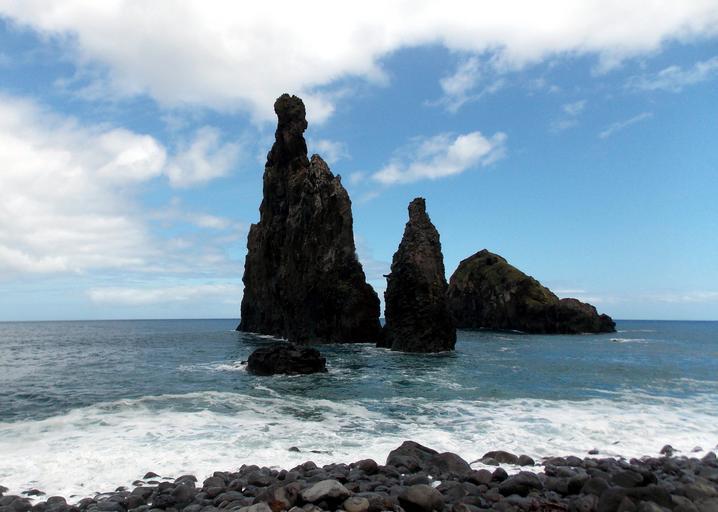Keywords: sea island atlantic rock cliff ocean wave spray beach stone beach holiday flower island madeira sky cloudy summer portugal water waters