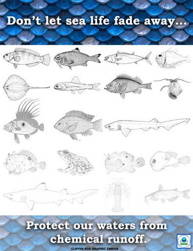Keywords: This is a graphic design example promoting clean water. The fading illustrates the concept of fading sea life, and draws the eye to the message. By Clever Fox Website and Graphic Design. ocean life sea inspiration fish water river poster design shark graphic example bayou fade preserve psa chemical conserve runoff |