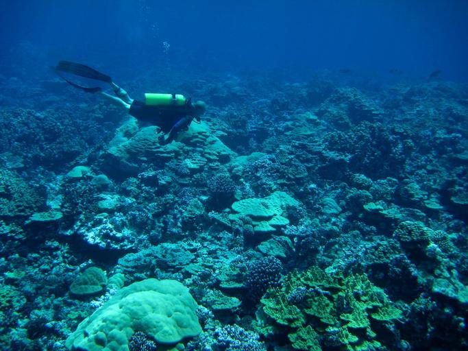 Keywords: sea ocean water underwater diver man exploring swimming coral plants sea-life