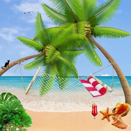 Keywords: sea palm trees beach holiday ocean summer tropical sand water coconut relaxation hammock shells beach towel black cat tranquility collage