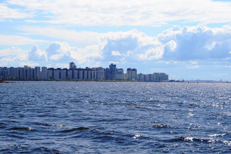 Keywords: sea water blue ocean glistening row of buildings tip of land clouds