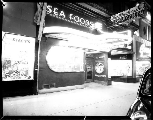 | Keywords: vancouver neon blackandwhite monochrome black and white PHOTO NUMBER: 81206 DESCRIPTION: Fish & Oyster Bar, Granville Street, Vancouver, BC. PHOTOGRAPHER: Artray DATE: 1950 SUBJECTS: Restaurants, Neon, Duchess Beauty Salon, More information on our historical photograph collection: www.vpl.ca/historicalphotos PHOTO NUMBER: 81206 DESCRIPTION: Fish & Oyster Bar, Granville Street, Vancouver, BC. PHOTOGRAPHER: Artray DATE: 1950 SUBJECTS: Restaurants, Neon, Duchess Beauty Salon, More information on our historical photograph collection: www.vpl.ca/historicalphotos |