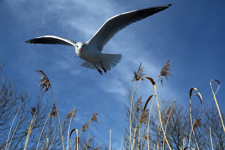 Keywords: seagull fly bird wing freedom locomotion feather plumage air flight form water bird animal spring dress bird flight nature creature bill covered cloudiness sky landscape blue cloud reed grasses teichplanze marsh plant bank