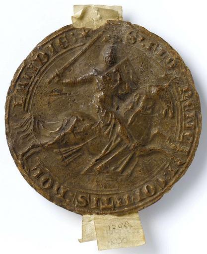 | Keywords: Seal of Floris V count of Holland.jpg nl Zegel met tegenzegel in bruine was van graaf Floris V van Holland Voorzijde een naar rechts galopperend paard met een man in volle wapenrusting De man heeft een zwaard in de opgeheven rechterhand en in de linkerhand een 'petit écu' met heraldisch embleem en Seal with counterseal in brown wax of Count Floris V of Holland Front a horse galloping to the right with a man in full armor The man has a sword in his right hand and in the left hand a 'petit ecu with heraldic emblem de Siegel mit gegen Siegel von Graf Floris V von Holland Vorne ein nach Rechts galoppierenden Pferd mit einem Mann in voller Rüstung Der Mann hat ein Schwert in der rechten Hand und die linke Hand ein petit Ecu mit heraldischen Emblem fr Timbre avec compteur sceau du comte Floris V de Hollande Avant un cheval au galop avec un homme en armure complète L'homme a une épée dans sa main droite et la main gauche un «écu de petit emblème héraldique hu Pecsét a számláló pecsétje Floris V Hollandi gróf Elöl a vágtató ló egy ember teljes fegyverzetben A férfi egy karddal a jobb kezét és a bal kéz a petit ecu a heraldikai jelkép 1288 Institution Rijksmuseum Object number NG-KOG-1901-52 anonymous cc-zero Uploaded with UploadWizard Floris V of Holland in seals Seals of the Netherlands 13th-century seals |