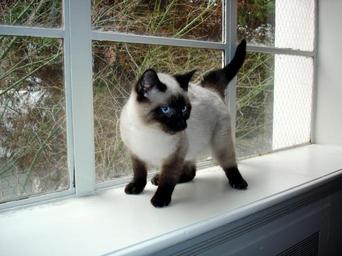 Keywords: seal point siamese kitten feline cat kitty pet domestic purebred shorthair fur animal hair window sill looking portrait young pedigree playing indoors