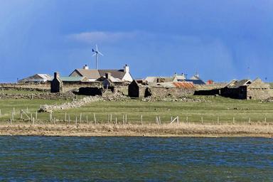 Keywords: seascape scenery island sea water beach landscape nature sky coast scenic coastline blue shore farmhouse farm wind turbine