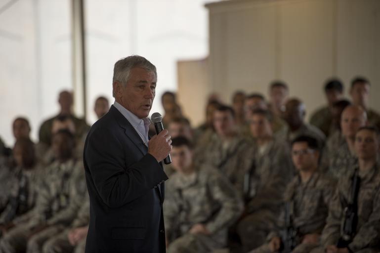 | Keywords: SecDef visits Iraq 141209-D-DT527-063.jpg en Secretary of Defense Chuck Hagel addresses service members at Baghdad International Airport Iraq during a visit Dec 9 2014 Photo by Master Sgt Adrian Cadiz/Released 2014-12-09 Master Sgt Adrian Cadiz https //www dvidshub net/image/1692565 141209-D-DT527-063 2014-12-09 16 06 BAGHDAD IQ PD-USGov Chuck Hagel Images from DoD uploaded by Fæ | ||||