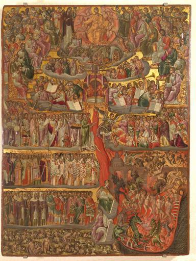 | Keywords: Second Coming by G.Klontzas (16th c.).jpg Η Δευτέρα Παρουσία τέλη 16ου αιώνα 96x127εκ Γεώργιος Κλόντζας ΧΟΡΟC ΠΑΤΡΙΑΡΧΩ ΚΑΙ ΒΑCΙΛΕΩ ΧΟΡΟC ΙΕΡΕΩ ΑΡΧΙΕΡΕΩ ΚΑΙ ΠΑΤΡΙΑΡΧΩ ΧΟΡΟC ΑΓΙΩ ΓΥ ΑΙΚΩ ΚΑΙ ΒΑCΙΛΕΩ ΧΟΡΟC ΟCΙΩ ΑCΚΗΤΩ ΚΑΙ ΑΡΤΥΡΩ Γύρω α ό τον κατακόρυφο άξονα ου δημιουργείται α ό τον ύρινο οταμό ο ο οίος καταλήγει στην Κόλαση οργανώνεται αυτή η αράσταση της Δευτέρας Παρουσίας ένα α ό τα σημαντικότερα έργα του Κλόντζα Ε άνω και στο μέσο αριστάνεται ο Ιησούς Κριτής λαισιωμένος α ό τον Ιωάννη τον Πρόδρομο και την Παναγία τους α οστόλους και λήθος αγγέλων Στα όδια του βρίσκονται τα σύμβολα των ευαγγελιστών και νεκροί ου αναμένουν την ώρα της Κρίσης Πιο κάτω αριστάνονται η Ετοιμασία του θρόνου οι δίκαιοι σε τρεις διαδοχικές σειρές και στο κάτω μέρος η έγερση των νεκρών με τους σκελετούς ου αναδύονται α ό τους τάφους Δεξιά βρίσκεται ο αρχάγγελος ιχαήλ ου υψώνει το σ αθί α ειλώντας μία ομάδα ανθρώ ων και το υ όλοι ο τμήμα καταλαμβάνεται α ό την Κόλαση με την κάμινο του υρός το αναγεννησιακό οικοδόμημα με τον τρούλλο Τέλος κάτω στο μέσον της εικόνας εικονίζονται οι ροφήτες Δαβίδ και Ιεζεκιήλ με λάκες στις ο οίες υ άρχουν ε ιγραφές ου αναφέρονται στην Κόλαση http //eib xanthi ilsp gr/gr/icons asp late 16th century Creator Georgios Klontzas Georgios Klontzas Files uploaded by Shakko from various sources Icons of Last Judgment PD-old |