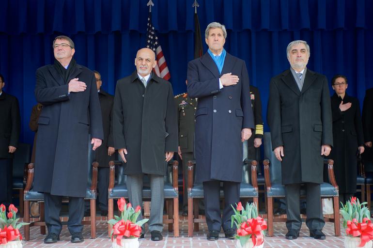 | Keywords: Secretaries Carter, Kerry Welcome Afghan President Ghani and CEO Abdullah to Pentagon Honor Cordon.jpg en U S Defense Secretary Ash Carter and U S Secretary of State John Kerry stand between Afghan President Ashraf Ghani and Afghan CEO Abdullah Abdullah on March 23 2015 at the Pentagon in suburban Washington D C as the National Anthem is played during an Honor Cordon ceremony where Ghani thanked U S government leaders military members and citizens for their support and sacrifices on behalf of his country since 2001 State Department photo/ Public Domain 2015-03-23 07 57 06 http //www flickr com/photos/9364837 N06/16286338054/ U S Department of State other versions 38 871322 -77 055916 PD-USGov PD-USGov Relations of Afghanistan and the United States Uploaded with UploadWizard |