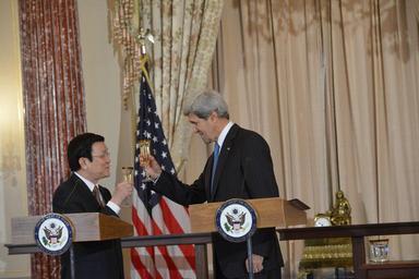 | Keywords: Secretary Kerry and Vietnamese President Truong Tan Sang Toast the U.S.-Vietnam Relationship.jpg en U S Secretary of State John Kerry and Vietnamese President Truong Tan Sang toast the U S -Vietnam relationship during their working lunch at the U S Department of State in Washington D C on July 24 2013 State Department photo/ Public Domain 2013-07-24 12 29 08 http //www flickr com/photos/statephotos/9361684518/sizes/o/in/photostream/ U S Department of State U S Department of State http //flickr com/photos/9364837 N06/9361684518 2013-07-31 17 53 02 United States Government Work PD-USGov Uploaded with UploadWizard John Kerry in 2013 |