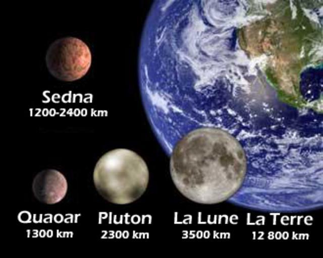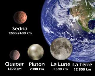 Keywords: Sedna-comp.jpg Warning This 2004 image is obsolete Quaoar is now estimated to be about http //arxiv4 library cornell edu/abs/1003 5911 890 km in diameter and Sedna is now estimated to be http //arxiv org/abs/astro-ph/0702538v2 less than 1600km in diameter This image was copied from wikipedia fr The original description was ;description Vue d'artiste comparant la taille de fr 90377 Sedna avec d'autres objets du fr Système solaire comme la fr Terre la fr Lune Pluton et fr 50000 Quaoar dont on pensait jusqu'à présent 2004-mar-15 qu'il était le plus grand corps céleste après Pluton Le diamètre de Sedna est légèrement inférieur à celui de Pluton mais supérieur à celui de Quaoar ;source http //www spitzer caltech edu/Media/releases/ssc2004-05/ssc2004-05c shtml copyright originale The artist's rendition shows the newly discovered planet-like object dubbed Sedna in relation to other bodies in the Solar System including Earth and its Moon; Pluto; and Quaoar a planetoid beyond Pluto that was until now the largest known object beyond Pluto The diameter of Sedna is slightly smaller than Pluto's but likely somewhat larger than Quaoar 1 date/time username resolution size edit summary ---- loveless Sedna Solar System object comparisons Pluto size comparisons Moon size comparisons Quaoar Earth size comparisons ImageNote 1 24 169 58 47 330 264 2 Quaoar is now estimated to be only 890 km in diameter http //arxiv4 library cornell edu/abs/1003 5911 ImageNoteEnd 1 |
