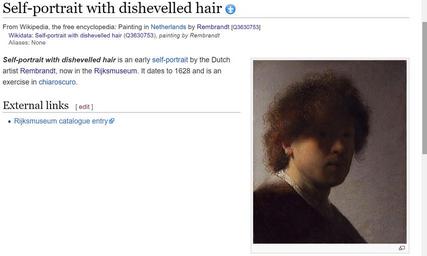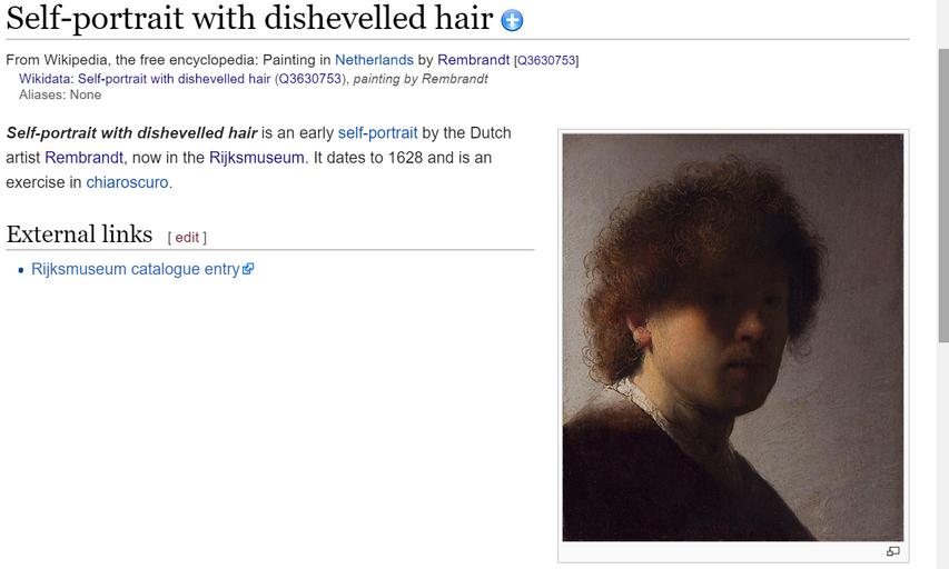 Keywords: Self Portrait of Rembrandt aged 21 Rijksmuseum - enwiki article 25-jun-2016.png en Screenshof of enwiki article about Rembrandt painting used as an example for Wikimania 2016 https //wikimania2016 wikimedia org/wiki/User_digest/GLAM <br>https //en wikipedia org/wiki/Self-portrait_with_dishevelled_hair <br> https //pl wikipedia org/wiki/Autoportret_ Rembrandt <br> https //it wikipedia org/wiki/Autoritratto_con_capelli_scompigliati <br> https //nl wikipedia org/wiki/Zelfportret_op_jeugdige_leeftijd_ 1628 <br> https //www wikidata org/wiki/Q3630753 <br> https //tools wmflabs org/glamtools/glamorgan html <br> https //en wikipedia org/wiki/List_of_paintings_by_Rembrandt 2016-06-25 own Jane023 cc-by-sa PD-Art-100 other versions <gallery>File Zelfportret Rijksmuseum SK-A-4691 jpeg from GLAM 0 views in 2016-01 Category Self-portrait Rembrandt c 1628 File Self-portrait 1628-1629 by Rembrandt jpg enwiki it wiki nlwiki 79 593 views in 2016-01 Category Self-portrait Rembrandt c 1628 File Rembrandt Harmensz van Rijn - Zelfportret op jeugdige leeftijd - Google Art Project jpg Wikidata item LIst of Rembrandt paintings 11 211 views in 2016-01 Category Self-portrait Rembrandt c 1628 File Rembrandt-self-portrait-1628 jpg plwiki 21 002 views in 2016-01 Category Self-portrait Rembrandt After 1628 Gemäldegalerie Alte Meister Kassel </gallery> cc-by-sa-4 0 Wikimania 2016 - GLAM Wikipedia screenshots |