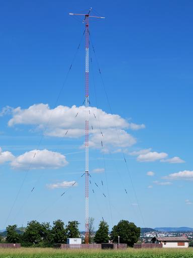 Keywords: Sendemast Hirschlanden.jpg Mast radiator broadcasting antenna with a capacity hat at the top for electrical lengthening Radio mast of the medium wave transmitter in Hirschlanden Baden-Württemberg Germany of the Deutsche Telekom AG for the AFN The screen of wires supported by the four radial arms at the top of the antenna acted as a capacitor plate with the ground as the other plate Each cycle of the alternating current radio signal current flows in and out of the hat just as if the tower continued above it This serves to increase the current in the top part of the antenna increasing the radiated power as if the tower was longer Selbststrahlender Sendemast mit Dachkapazität Sendemast des Mittelwellensenders Hirschlanden Baden-Württemberg der Deutschen Telekom AG für den AFN own Harke 2009-06-03 thumb left 0 6 48 49 43 95 N 9 2 6 19 E zoom 15 QualityImage Sender Hirschlanden Taken with Nikon D60 Quality Images by User Harke Quality images of Landkreis Ludwigsburg Antenna masts with capacitive top hats |