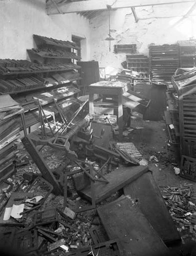 | Keywords: waterford news waterfordnews newspaper news office newsoffice fire caseroom type september 1923 1920s poole collection poolecollection glass negative glassnegative a.h. poole ahpoole arthur henri poole arthurhenripoole national library of ireland nationallibraryofireland location identified locationidentified waterford o'connell street oconnellstreet blackandwhite monochrome outdoor black and white The offices of the Waterford News in the aftermath of a fire on Sunday, 26 August 1923. On the same day that this photo was taken, the Irish Times reported: "On Sunday night the offices of the Waterford News, whose policy latterly has been markedly Republican, were burned down. The commercial and editorial offices, the latter containing many valuable historical books and records of Waterford County and City, as well as stores containing hundreds of pounds worth of paper, were completely destroyed. The Civic Guards were quickly on the scene, with members of the newspaper staff. The City Fire Brigade succeeded in saving all the machinery and type. The damage, however, is estimated at several thousands, and is not wholly covered by insurance." Unsure of the location of the Waterford News at this time, so if anyone knows, please speak up... Date: 1 September 1923 NLI Ref.: P_WP_3120 The offices of the Waterford News in the aftermath of a fire on Sunday, 26 August 1923. On the same day that this photo was taken, the Irish Times reported: "On Sunday night the offices of the Waterford News, whose policy latterly has been markedly Republican, were burned down. The commercial and editorial offices, the latter containing many valuable historical books and records of Waterford County and City, as well as stores containing hundreds of pounds worth of paper, were completely destroyed. The Civic Guards were quickly on the scene, with members of the newspaper staff. The City Fire Brigade succeeded in saving all the machinery and type. The damage, however, is estimated at several thousands, and is not wholly covered by insurance." Unsure of the location of the Waterford News at this time, so if anyone knows, please speak up... Date: 1 September 1923 NLI Ref.: P_WP_3120 |