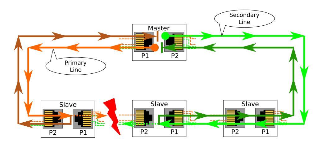 | Keywords: SERCOS III Control Interface Ring Break diagram.svg en Diagram illustrating the data flow after a SERCOS III industrial control interface network has recovered from a ring break own SCH56 2009-07-23 Translation possible Created with Inkscape Network diagrams IEC standards SERCOS SVG network diagrams |