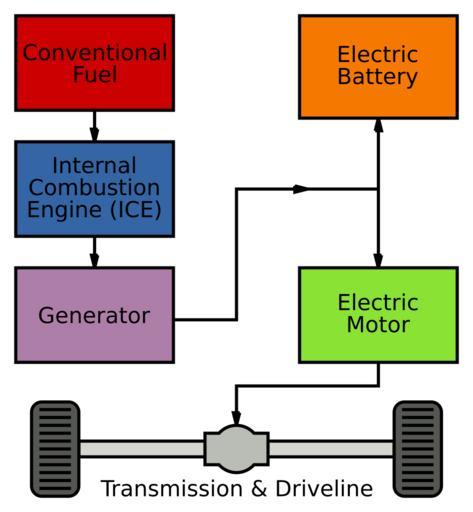 Keywords: Serial Hybrid ICE-Electric.svg en A drivetrain of a serial hybrid ICE-electric vehicle Own Inductiveload 2009-04-20 Hybrid-powered vehicles