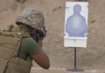 | Keywords: Service members fire weapons DVIDS278398.jpg en Marine Lcpl Adonai Morales a member of the Combined Joint Task Force-Horn of Africa fires an M-16 round at a silhouette target during a U S Marine Corps Enhanced Marksmanship Range evolution at the Djibouti City police department gun range May 12 Morales and nearly 20 military members deployed to Camp Lemonnier Djibouti participated in the exercise which focuses on advanced tactical weapons training 2010-05-12 Petty Officer 2nd Class Marc Rockwell-Pate https //www dvidshub net/image/278398 100512-N-+++++-088 2010-05-12 10 06 DJIBOUTI DJ PD-USGov-Military-Navy Combined Joint Task Force - Horn of Africa Camp Lemonnier Images from DoD uploaded by Fæ |
