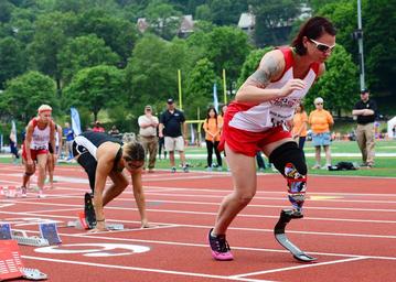 Keywords: Service Members Participate in DoD Warrior Games Track and Field Event 160616-N-JP566-156.jpg en WEST POINT N Y June 16 2016 -- From right Marine Corps veteran Lance Cpl Sarah Rudder Army veteran Sgt Ana Manciaz and Marine Corps veteran Jessica Hammack take the line for the women's 200-meter dash at the 2016 DoD Warrior Games held at the U S Military Academy at West Point N Y June 16 The DoD Warrior Games June 15-21 is an adaptive sports competition for wounded ill and injured service members and Veterans Athletes representing teams from the Army Marine Corps Navy Air Force Special Operations Command and the United Kingdom Armed Forces compete in archery cycling track and field shooting sitting volleyball swimming and wheelchair basketball U S Navy photo by Mass Communication Specialist 1st Class Patrick Gordon/Released <br>Unit Naval Mobile Construction Battalion Two Five NMCB-25 2016-06-16 Petty Officer 1st Class Patrick Gordon https //www dvidshub net/image/2666355/service-members-participate-dod-warrior-games-track-and-field-event 160616-N-JP566-156 2016-06-16 21 13 WEST POINT NY US PD-USGov-Military-Navy Warrior Games Images from DoD uploaded by Fæ |