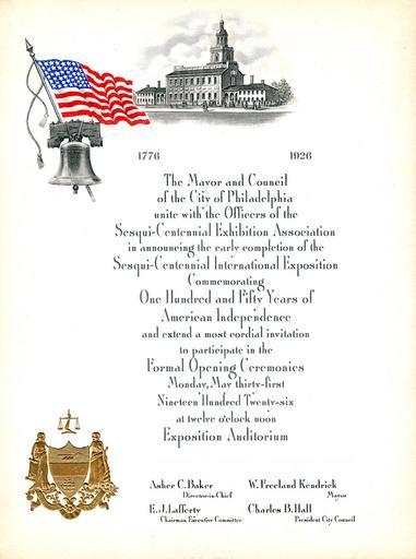Keywords: Sesqui-Centennial Invitation.jpg Engraved invitation to the Opening Ceremonies for the 1926 Sesqui-Centennial Exposition at Philadelphia Pa May 31 1926 Courtesy of the Bruce C Cooper Collection en wikipedia Stevenliuyi CommonsHelper 2008-03-25 Centpacrr wikipedia en Centpacrr March 2008 original upload log page en wikipedia Sesqui-Centennial_Invitation jpg 2008-03-25 10 42 Centpacrr 1106×1486× 334736 bytes <nowiki>Engraved invitation to the Opening Ceremonies for the 1926 Sesqui-Centennial Exposition at Philadelphia Pa May 31 1926 License information Centpacrr </nowiki> Sesquicentennial Exposition |