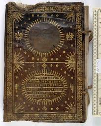 | Keywords: Settimo libro della depositeria generale della Reverenda Camera Appostolica lanno 1572 -Manuscript on paper- - Upper cover (Davis869).jpg Style Circle Lettered cover eg intitals titles; Caption Upper cover; Colour Brown; Edge Plain exhibition history Decorative Technique Tooled in blind Tooled in gold; Cover Material Goatskin includes morocco turkey etc Traces of 2 pairs of ties Possibly by Francesco Soresino c1572 binder to the Vatican after the death of Niccolo Franzese object history Text 1572; Rome; Unspecified object type Cc-zero place of creation Binding Italy place of discovery M M Foot The Henry Davis Gift vol III London 2010 p 409 British Library image http //www bl uk/catalogues/bookbindings/LargeImage aspx RecordId 020-000002170 ImageId ImageId 40690 Copyright BL Settimo libro della depositeria generale della Reverenda Camera Appostolica lanno 1572 Manuscript on paper Uploaded with GWToolset Settimo libro della depositeria generale della Reverenda Camera Appostolica lanno 1572 Manuscript on paper - Upper cover Davis869 http //www webarchive org uk/bldatasets/bindings/7192_4 jpg Bookbinding 16th-century bookbinding British Library Bookbindings |