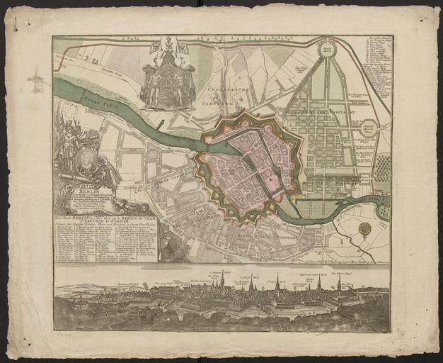 Keywords: Seutter Berlin die Praechtigst. u. maechtigste Hauptstatt.. 1738.jpg InteractiveViewer de Der Plan ist eine relativ genaue Kopie desjenigen von Dusableau 1737 Unter dem Plan befindet sich eine Vedute nach Johann Christoph Haffner Das hier vorliegende Exemplar nennt Lotter als Verleger abweichend davon gibt es auch Blätter wo Seutter genannt ist Unten rechts im Plan die Druckerlaubnis Cu Grat et Pr S R I Vicari atg in part Rheni Sveviae et Juris Franconici Links unten in einer Kartusche der Titel und eine Legende Die Stadt Berllin hat Vier Theil als mit 41 Straßen 19 Kirchen 6 Tore und 11 Brücken Legende und Titel sind von einer Allegorie umgeben die den Kriegsgott Mars zusammen mit allerlei Kriegsgerät zeigt und ein Medaillon mit dem Porträt von Friedrich Wilhelm I Links oben das Königliche Wappen Rechts oben ist die Legende ergänzt um M-Y Creator Matthäus Seutter Creator Tobias Lotter 1738 Biblioteka Cyfrowa Uniwersytetu Wroclawskiego http //fbc pionier net pl/id/oai www bibliotekacyfrowa pl 41687 oai www bibliotekacyfrowa pl 41687 map date Berlin wikidata location Q64 8600 S de print date Biblioteka Cyfrowa Uniwersytetu Wroclawskiego accession number 1678-III C Size cm 56 8 49 0 Size cm 56 3 37 9 nur der Plan de kolor Kupferstich Literatur G Schulz Die Stadtpläne von Berlin 1652-1920 Nr 75 other versions <gallery> File Seutter Berlin die Praechtigst u maechtigste Hauptstatt 1738 jpg File Seutter Berlin die Praechtigst u maechtigste Hauptstatt 1738b jpg </gallery> PD-old-100 1738 in Berlin Old maps of Berlin 1738 Maps by Seutter Tobias Lotter |