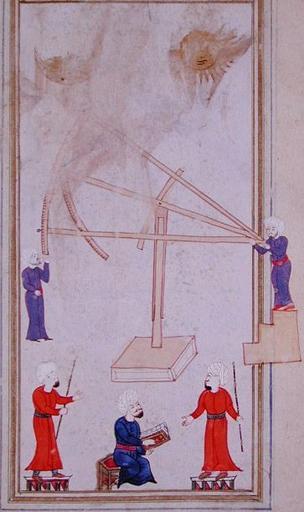 Keywords: Sextant TakiyüddinRasid TopkapiPalaceMuseum.jpg en Depiction of the en sextant used in astronomy and astrology by the Ottoman Observatory in Istanbul and by the office of müneccimbaşı chief astrologer in the 16-17th centuries http //www muslimheritage com/topics/default cfm ArticleID 949 From Al-âlât al rasadiya li-zij al-shahinshahiyya by en Taqi al-Din Muhammad ibn Ma'ruf Library of the en Topkapi Palace Museum Hazine 452 fol 14b second half of the 16th century published in several works treating science in Turkish and/or Islamic history PD-old Astronomy in medieval miniatures Astronomy in Turkey Uploads by User Cretanforever Turkish Illuminated manuscripts in the Topkapi Palace Museum Istanbul Observatory Islamic sextant |