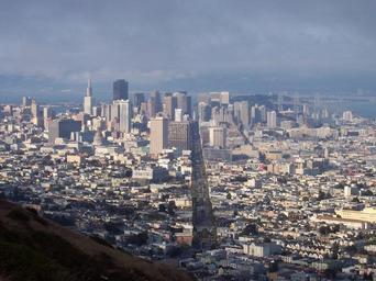 | Keywords: Sf-skyline-twin-peaks.30jun2004.jpg A view of downtown San Francisco California from Twin Peaks Several city landmarks are visible in this photo The tree-lined boulevard aligned with the camera's perspective visible in the center of the photograph is Market Street At the eastern end the Ferry Building is visible on the waterfront At the other end is the giant rainbow flag at Castro Street which marks where the street turns to wind its way into the hills A few buildings to the right of the flag the Castro Theatre stands a story or two above its neighbors Farther down Market Street a rectangular Safeway sign pokes up standing just to the right of the old mint which is a large imposing building perched on a steep barren hill The two tallest buildings on the left are the Transamerica Pyramid and the Bank of America building The gold-encrusted dome of City Hall is visible in the foreground between them In the upper right the western span of the San Francisco-Oakland Bay Brideg arcs out to Yerba Buena Island The hills of the East Bay mostly Berkeley and Oakland can be seen through the haze over San Francisco Bay Photographer Christopher Beland Date 30 June 2004 Equipment Kodak EasyShare CX6330 digital camera San Francisco skylines The Castro San Francisco LGBT pride flags in the United States Photographs of LGBT pride flags Photographs of LGBT pride flags Taken with Kodak EasyShare CX6330 Noe Valley San Francisco Market Street San Francisco Twin Peaks San Francisco California |