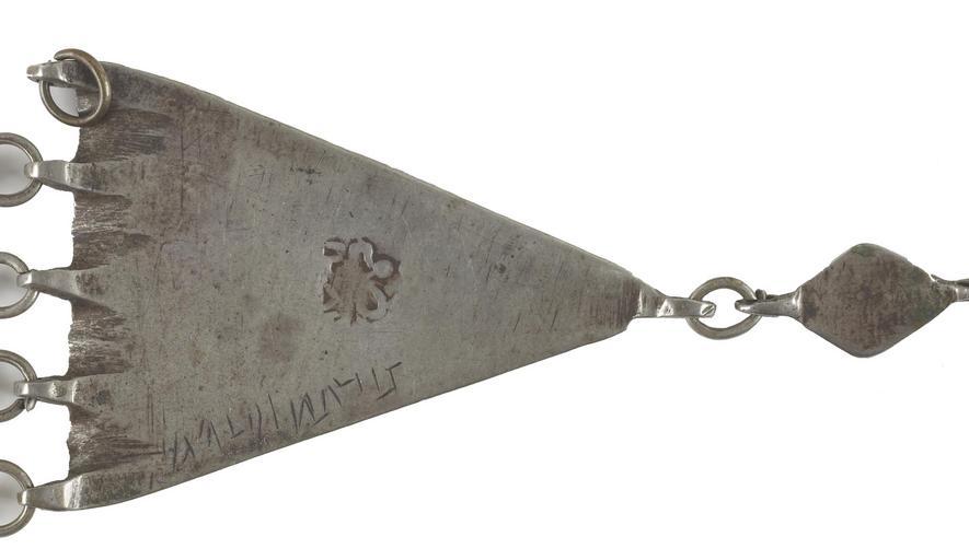 | Keywords: Sh Sharayan - Pair of Linked Triangular Pendants from a Woman?s Headpiece - Walters 572313 - Mark A.jpg The triangular pedants are cast and the top and the five bottom loops soldered on The top loop holds a ring which connects the main pendant with a small rhombic element decorated with an attached five-ring filigree-like motif This element has an additional loop to fasten it at the headscarf The décor of the triangles combines a stylized rosette with tear-shaped elements; a bead-molded border frames the motif The single and double chains which are hanging down from the loops of the triangles fit together by small rings The missing single or double chain was originally fastened at the upper loop of one and the lower loop of the other triangle This arrangement was used because the chains were twisted toward each other On the back of both triangles is an Arabic stamp with the date nusfi 1287 the term nusfi means half In AH 1287 AD 1870/1 al-Hadi Galib ruled in Sana a' but also Saykh Muhsin b Ali Mu'id In addition there is an engraved Hebrew inscription with the name of the silversmith Sh lomo Sharayan mahasit The term mahasit means half The elongated hooks are probably modern additions 1287 AH/AD 1870-1871 silver Triangle H without loops 2 3/8 x W of base 1 7/8 in 6 x 4 7 cm accession number 57 2313 80917 Mr Benjamin Zucker Zucker Family Trust and Mr Derek Content New York and London by purchase Walters Art Museum Joint gift to the Walters Art Museum Baltimore and the Israel Museum Jerusalem by Mr Benjamin Zucker and Mr Derek Content in honor of Mrs Barbara Zucker and Mrs Amanda Content 2010 Stamp Arabic nusfi 1287 AH Engraving Hebrew S lomo Sarayan mahasit place of origin Raydah Yemen Walters Art Museum license Jewellery in the Walters Art Museum South Arabian art in the Walters Art Museum Sh Sharayan Media contributed by the Walters Art Museum needs category review Sh Sharayan - Pair of Linked Triangular Pendants from a Woman?s Headpiece - Walters 572313 - Mark A.jpg The triangular pedants are cast and the top and the five bottom loops soldered on The top loop holds a ring which connects the main pendant with a small rhombic element decorated with an attached five-ring filigree-like motif This element has an additional loop to fasten it at the headscarf The décor of the triangles combines a stylized rosette with tear-shaped elements; a bead-molded border frames the motif The single and double chains which are hanging down from the loops of the triangles fit together by small rings The missing single or double chain was originally fastened at the upper loop of one and the lower loop of the other triangle This arrangement was used because the chains were twisted toward each other On the back of both triangles is an Arabic stamp with the date nusfi 1287 the term nusfi means half In AH 1287 AD 1870/1 al-Hadi Galib ruled in Sana a' but also Saykh Muhsin b Ali Mu'id In addition there is an engraved Hebrew inscription with the name of the silversmith Sh lomo Sharayan mahasit The term mahasit means half The elongated hooks are probably modern additions 1287 AH/AD 1870-1871 silver Triangle H without loops 2 3/8 x W of base 1 7/8 in 6 x 4 7 cm accession number 57 2313 80917 Mr Benjamin Zucker Zucker Family Trust and Mr Derek Content New York and London by purchase Walters Art Museum Joint gift to the Walters Art Museum Baltimore and the Israel Museum Jerusalem by Mr Benjamin Zucker and Mr Derek Content in honor of Mrs Barbara Zucker and Mrs Amanda Content 2010 Stamp Arabic nusfi 1287 AH Engraving Hebrew S lomo Sarayan mahasit place of origin Raydah Yemen Walters Art Museum license Jewellery in the Walters Art Museum South Arabian art in the Walters Art Museum Sh Sharayan Media contributed by the Walters Art Museum needs category review |