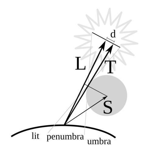 | Keywords: Shadow of Sphere.svg en A diagram showing the vectors used in calculating the shadowing of a sphere at a point on a surface L vector to the light source S vector to the center of the sphere T tangent vector to the sphere d distance of tangent from the center of the light source Image originally created by User Fuzzypeg in Inkscape and modified by User Martin Kraus; released to the public domain 2011-06-27 own Martin Kraus cc-zero Uploaded with UploadWizard Illustrations | ||||