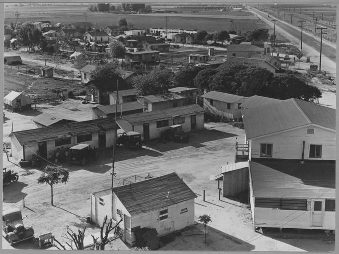 | Keywords: Shafter, Kern County, California. Typical of Shafter area. Shows auto camp behind grocery which face . . . - NARA - 521682.jpg Scope and content Full caption reads as follows Shafter Kern County California Typical of Shafter area Shows auto camp behind grocery which faces highway Used as permanent housing for agricultural workers on and off relief Rent about 15 per month Lots in background cost approximately 400 Low rate of payment Note also tent space and shack space on subdivided small lots F S A camps for farm laborers in the distance down the highway General notes 521682 Local identifier 83-G-41438 Department of Agriculture Bureau of Agricultural Economics Division of Economic Information ca 1922 - ca 1953 NARA-Author Lange Dorothea 1895-1965 Photographer 1372774 <br /> Still Picture Records Section Special Media Archives Services Division NWCS-S National Archives at College Park 8601 Adelphi Road College Park MD 20740-6001 1940-04-11 Record group Record Group 83 Records of the Bureau of Agricultural Economics 1876 - 1959 Record group ARC 412 Photographic Prints Documenting Programs and Activities of the Bureau of Agricultural Economics and Predecessor Agencies compiled ca 1922 - ca 1947 documenting the period ca 1911 - ca 1947 Series ARC 521048 File unit File unit ARC Variant control numbers NAIL Control Number NWDNS-83-G-41438 Other versions <gallery> File Shafter _Kern_County _California _Typical_of_Shafter_area _Shows_auto_camp_behind_grocery_which_face_ _ _ _-_NARA_-_521682 tif tif File Shafter _Kern_County _California _Typical_of_Shafter_area _Shows_auto_camp_behind_grocery_which_face_ _ _ _-_NARA_-_521682 jpg jpg </gallery> NARA-cooperation PD-USGov Auto camps History of Kern County California Dorothea Lange |