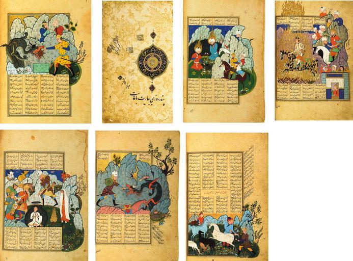 | Keywords: Shahnamah.jpg en An illustrated manuscript of the Shah Namah that may have belonged to Jahangir Source http //www christies com/LotFinder/search/LotDetail asp sid intObjectID 3052252 SE CMWCAT02+592+1839017235+ QR M+1+261+Aqc0000900+569++Aqc0000900+ entry india SU 1 RQ True AN 262 downloaded Oct 2001 ABU'L QASIM FIRDAWSI D AH 416/1025 AD SHAHNAMEH Khorassan circa 1570 Persian manuscript on light buff paper 549ff with 25ll of black nasta'liq in four gold-outlined columns titles in red opening gold and polychrome illuminated bifolio catch words in black with seventy six miniatures in gouache heightened with gold opening flyleaf with gold floral illumination and roundel containing seal impression inscribed Shah Beg ibn Mirza beg Ataliq library inscriptions stating that the Shahnameh was bought and entered the library on 4th isfandarnadh regnal year 11 with seal impression dated 1032 slight flaking of miniatures slight water staining otherwise very good condition later tan morocco binding with gold tooled medallions and spandrels Folio 14¼ x 9½in 36 x 24 2cm ; text area 9½ x 5¾in 24 2 x 14 5cm Lot Notes This Shahnameh was produced for an Uzbek patron The name on the seal on the opening flyleaf is Shah Beg ibn Mirza Beg Ataliq as yet unidentified The style of the miniatures is close to Qazwin but the very strong colours and style of some of the headdresses suggest Herat The miniatures are the work of three or more artists and some of the subjects chosen for inclusion are unusual A close comparisom can be made with a near contemporaryShahnameh dated around 1576-7 Robinson B W Persian and Mughal Art Colnaghi exhibition catalogue London 1976 pp 32-47 The library note may be Mughal because of the way a Persian month is used and the style of writing and may have belonged to the Emperor Jahangir The name of the seal bearer is Rashid Khan but there is no record of an official with this name at the court of Jahangir The miniatures begin with f 3a Firdawsi in the presence of Sultan Mahmud of Ghazni with three courtiers ~ 1570 http //www columbia edu/itc/mealac/pritchett/00routesdata/1600_1699/jahangir/shahnamah/shahnamah html Shah Beg ibn Mirza Beg Ataliq PD-Art Uploaded with UploadWizard Shahnameh |