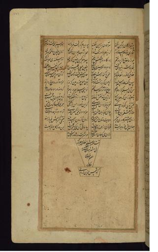 | Keywords: Shams al-Din Kirmani - Colophon - Walters W611287A - Full Page.jpg This folio from Walters manuscript W 611 contains a colophon in Arabic that gives the name of the scribe and the date of copying islamic 1649 1059 Safavid; Qajar ink pigments laid paper cm 29 5 17 accession number W 611 287A 83408 Ibrahim date and mode of acquisition unknown partly visible seal impression dated 1230 AH on fol 1a Henry Walters Baltimore date and mode of acquisition unknown Walters Art Museum Henry Walters Acquired by Henry Walters Transliteration place of origin Iran Walters Art Museum license 2D Khamsa of Nizami Safavid Walters MS 611 Media contributed by the Walters Art Museum needs category review |