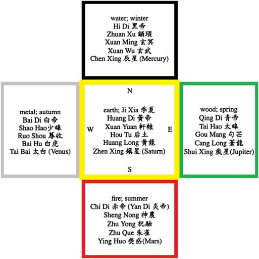 | Keywords: Shangdi-Huangdi religious cosmology.png Chinese traditional religious cosmology of the Wǔfāng Shàngdì 五方上 Five Forms of the Highest Deity with the Yellow Deity the Four-Faced God at the centre of the universe emanating the other four cosmological deities of directions and seasons Own reproduction of the scheme found at p 121 of The Chinese Sky During the Han Constellating Stars and Society 1997 by Xiaochun Sun and Jacob Kistemaker 23-2015 Aethelwolf Emsworth Confucianism Chinese folk religion |