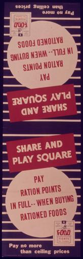 | Keywords: SHARE AND PLAY SQUARE. PAY RATION POINTS IN FULL - WHEN BUYING RATIONED FOODS. PAY NO MORE THAN CEILING PRICES. - NARA - 515392.jpg Scope and content General notes 515392 Local identifier 44-PA-1722 Office for Emergency Management Office of War Information Domestic Operations Branch Bureau of Special Services 03/09/1943 - 09/15/1945 Still Picture Records Section Special Media Archives Services Division NWCS-S National Archives at College Park 8601 Adelphi Road College Park MD 20740-6001 1941 - 1945 Record group Record Group 44 Records of the Office of Government Reports 1932 - 1947 Record group ARC 373 World War II Posters compiled 1942 - 1945 Series ARC 513498 File unit File unit ARC Variant control numbers NAIL Control Number NWDNS-44-PA-1722 Other versions <gallery> File SHARE_AND_PLAY_SQUARE _PAY_RATION_POINTS_IN_FULL_-_WHEN_BUYING_RATIONED_FOODS _PAY_NO_MORE_THAN_CEILING_PRICES _-_NARA_-_515392 tif tif File SHARE_AND_PLAY_SQUARE _PAY_RATION_POINTS_IN_FULL_-_WHEN_BUYING_RATIONED_FOODS _PAY_NO_MORE_THAN_CEILING_PRICES _-_NARA_-_515392 jpg jpg </gallery> NARA-cooperation PD-USGov World War II posters from the United States |
