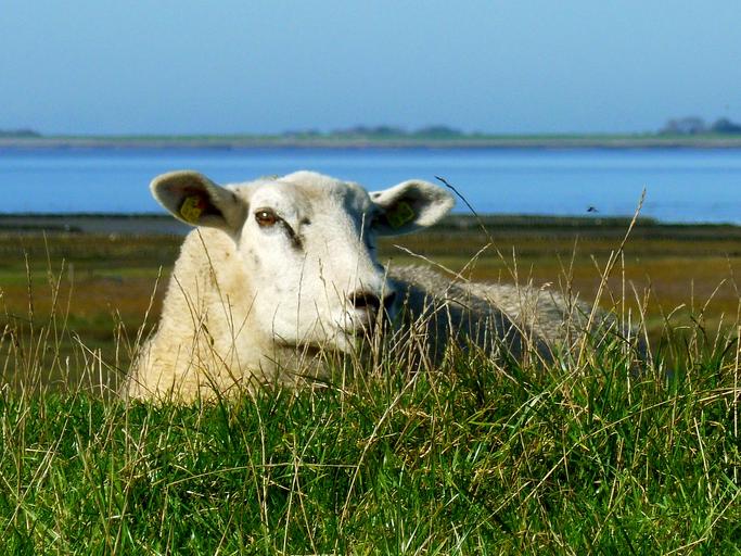 Keywords: sheep lying sheep exposed animal lying nature livestock animal grass sky green blue sky meadow dike landscape summer north sea
