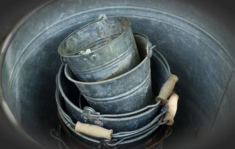 Keywords: sheet metal bucket old stack vessels garden used bucket grey dirty