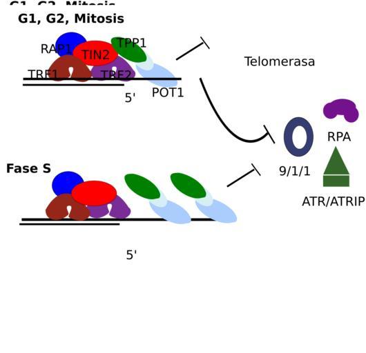 Keywords: Shelterin cell cycle.svg Shelterin Cycle Telosoma durante el ciclo celular own Gustavocarra 06-10-2010 Telosome