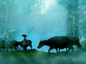 Keywords: shepherd people buffalo forest blue fog afternoon home child