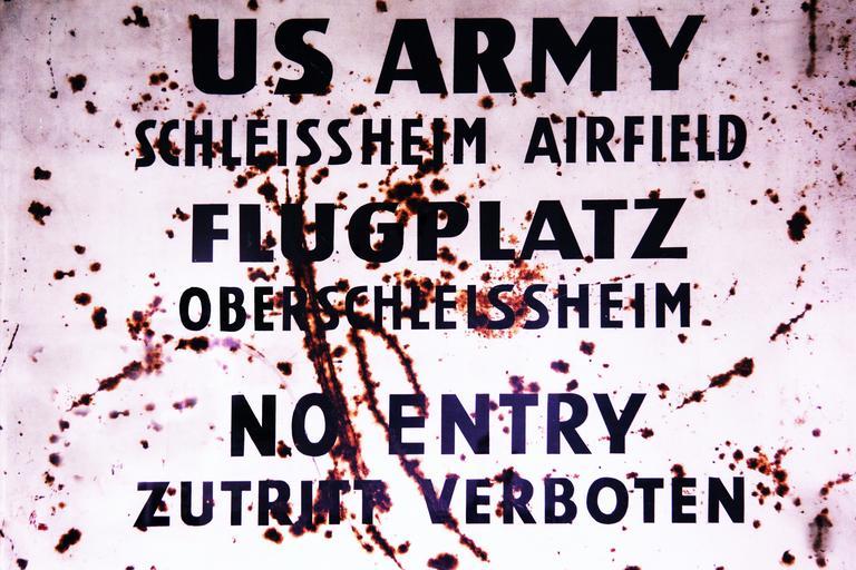 Keywords: shield prohibitory us army upper wear airfield access forbidden old schutzig rusted screwed 1948