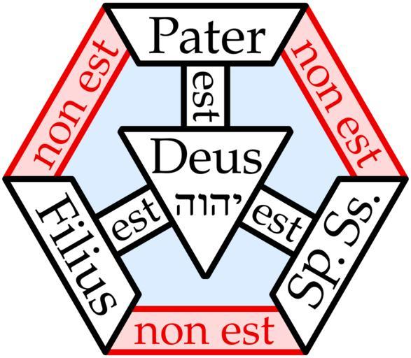 | Keywords: Shield of Trinity in hexagon.svg  A version of the Shield of the Trinity or Scutum Fidei diagram of traditional western Christian symbolism which fits within a hexagon The positive or asserting parts of the diagram are black while the negative or denying parts of the diagram are red Loosely inspired by an octagonal stained-glass window in Barcelona Cathedral http //wahrheitueberwahrheit blogspot com/2010/04/dreifaltigkeit-und-einfaltigkeit html For further information on the basic diagram see the en Shield of the Trinity article For translation into English see File Shield of Trinity in hexagon English svg Self-made image generated from a version of the following vector PostScript source code <pre> 306 396 translate 2 2 scale 1 setlinejoin 3 setlinewidth/Q 200 3 div def 100 0 moveto 1 1 5 60 mul dup cos 100 mul exch sin 100 mul lineto for closepath gsave 85 925 1 setrgbcolor fill grestore stroke gsave 3 30 cos 12 5 mul 30 sin 12 5 mul moveto 0 75 rlineto 468 75 sqrt neg 0 rlineto 0 -75 rlineto closepath gsave 1 setgray fill grestore stroke 120 rotate repeat grestore gsave 3 240 cos 100 mul 240 sin 100 mul moveto 300 cos 100 mul 300 sin 100 mul lineto 300 cos 75 mul 300 sin 75 mul lineto 240 cos 75 mul 240 sin 75 mul lineto closepath gsave 1 85 85 setrgbcolor fill grestore 925 0 0 setrgbcolor stroke 120 rotate repeat -35 6 -82 4 moveto/Palatino 22 selectfont non est show gsave 60 rotate -35 2 69 5 moveto non est show grestore gsave -60 rotate -35 2 69 5 moveto non est show grestore grestore gsave 3 120 cos 100 mul 120 sin 100 mul moveto 60 cos 100 mul 60 sin 100 mul lineto 60 cos Q mul 60 sin Q mul lineto 120 cos Q mul 120 sin Q mul lineto closepath gsave 1 setgray fill grestore stroke 120 rotate repeat grestore -28 7 63 moveto/Palatino 26 selectfont P show - 7 0 rmoveto a show - 4 0 rmoveto t show 2 0 rmoveto e show 2 0 rmoveto r show gsave 60 rotate -30 -80 3 moveto S show 25 4 4 rmoveto p show -4 5 -4 9 rmoveto show 4 5 5 rmoveto S show 25 0 rmoveto s show - 35 - 25 rmoveto show grestore gsave -60 rotate -29 7 -81 4 moveto Filius show grestore 0 -50 moveto 1875 sqrt 25 lineto 1875 sqrt neg 25 lineto closepath gsave 1 setgray fill grestore stroke -28 3 moveto/Palatino 25 selectfont De show - 2 0 rmoveto us show -90 rotate -54 2 -6 moveto/Palatino 21 selectfont est show 120 rotate -54 2 -6 moveto est show -60 rotate 28 3 -6 moveto est show showpage EOF</pre> 2012 AnonMoos Shield of the Trinity Hexagonal symbols Tetragrammaton in Christian art Images with PostScript source code SVG in Latin |